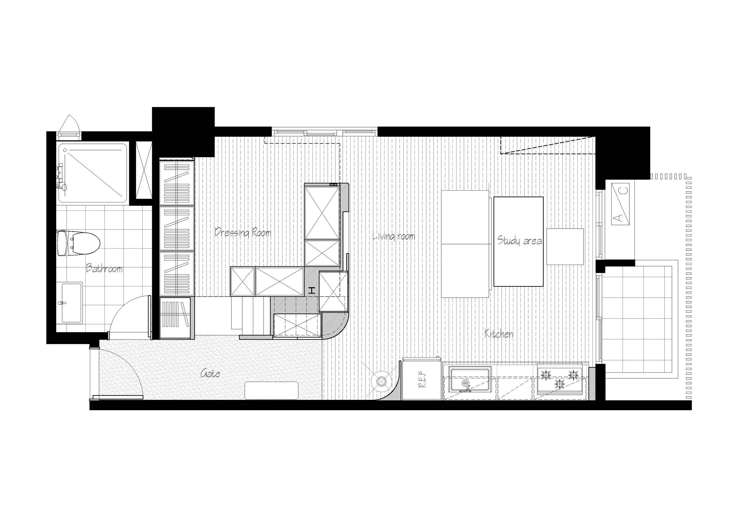布局巧妙地優化了動線與功能性,採用了雙向流動的設計以最大化空間的使用效率。設計將區域劃分為不同的功能區域:一個舒適的居住空間和一個專門的儲藏區,隱秘地存放著家庭的所有物品,從鞋櫃和二手衣物到衣櫃和影音設備。